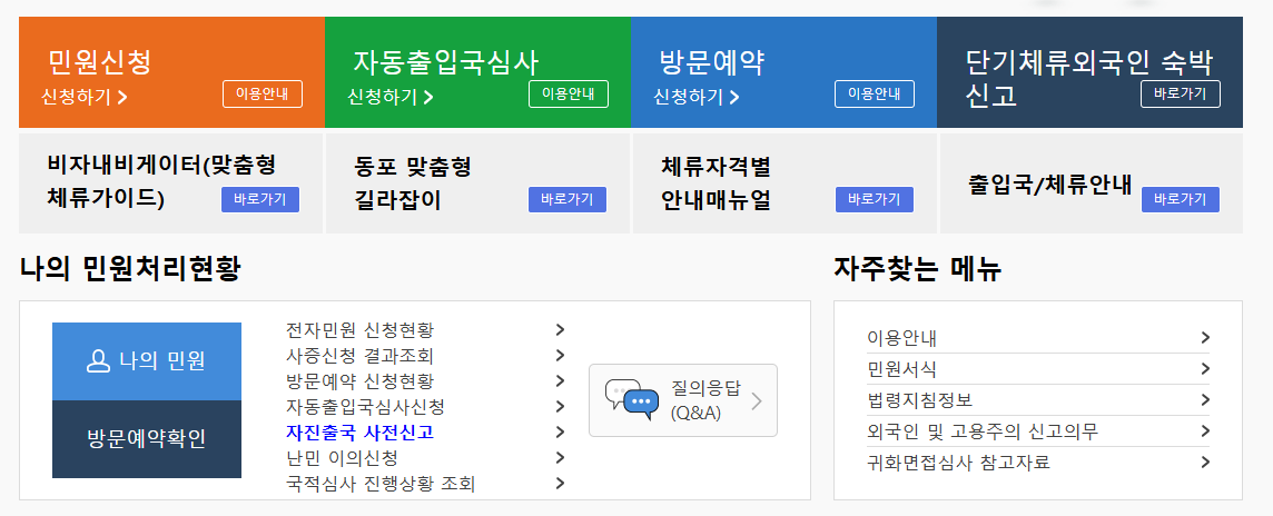 원하는 메뉴를 상단 혹은 좌측 메뉴에서 선택하세요. 자주 이용되는 메뉴는 ‘전자민원’, ‘방문예약’, ‘비자조회’입니다.