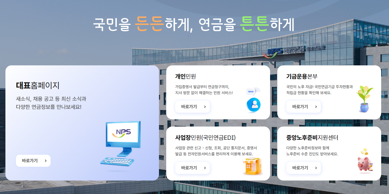 국민연금관리공단 홈페이지는 국민연금공단(National Pension Service, NPS)에서 운영하는 공식 웹사이트로, 국민연금과 관련된 모든 정보를 제공하고, 온라인 민원 처리가 가능한 종합 서비스 포털입니다.